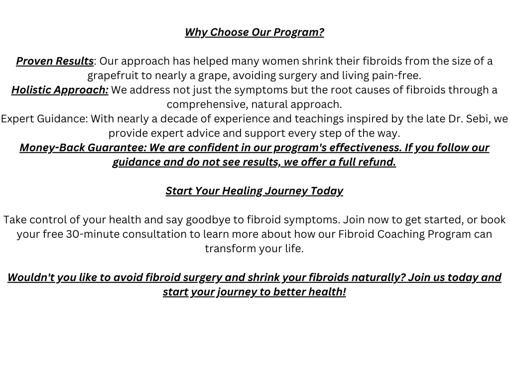 Wouldn’t you like to avoid fibroid surgery and shrink your fibroids naturally? Join our coaching program today and start seeing results in no time! Guaranteed!!